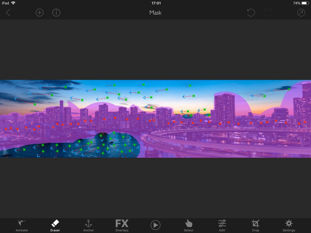 Created by simply dragging ‘animate’ arrows onto the waves on the river and directionally on the clouds and then using the mask tool to draw a dividing line between those two areas we ended up with that effect.