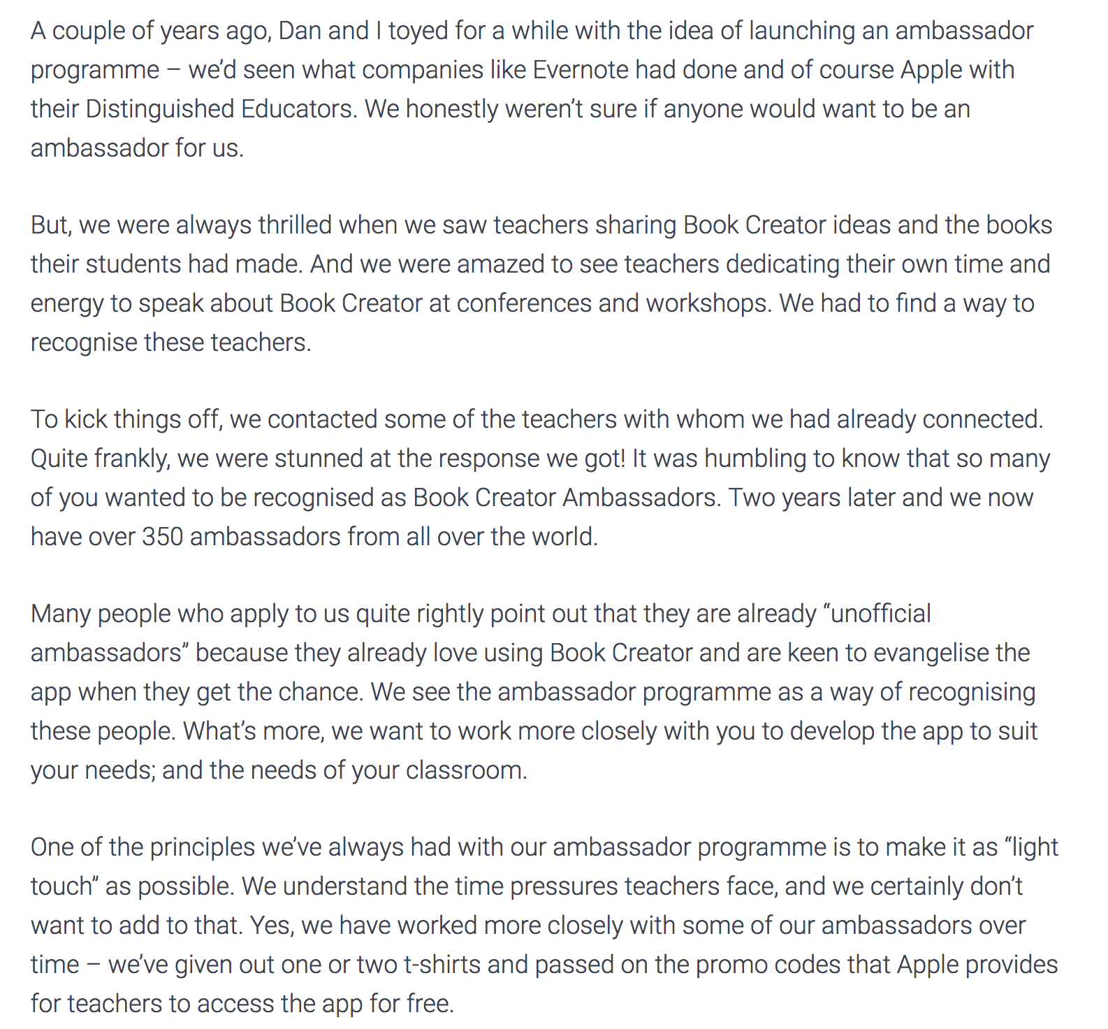 In terms of some of the others; ClassDojo came to me and two others, first of all, to ask about us being ambassadors because we were already championing and sharing the tool. I was using it in my classes. Same with Book Creator; although I have a long relationship with them being local in Bristol, but the initial contact came from using Book Creator with all students in Year 8 on a collaborative project. Showbie saw me sharing about Showbie because I’d been using it with my classes in school, so forth and so on….