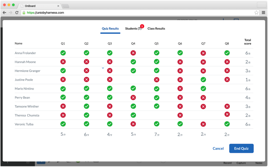 When you do run a quiz (as you can see from the image below) you are able to see results in real-time in a number of different views (individual student vs whole class, numerically in table or graphical form.