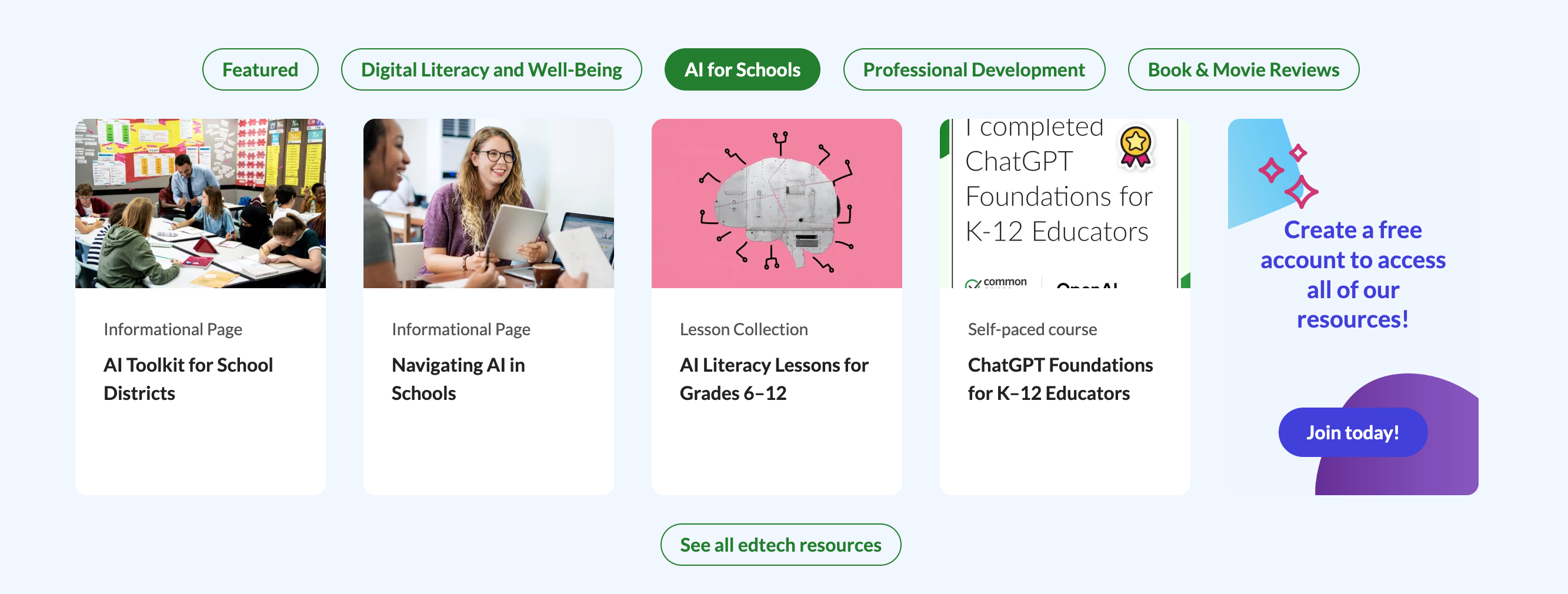 Common Sense has long been trusted by schools for its guidance on digital citizenship, media literacy and online safety. Its growing collection of AI resources builds on that foundation and offers something schools need right now: clear, age-appropriate, educator-focused support for navigating AI thoughtfully.