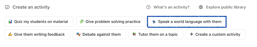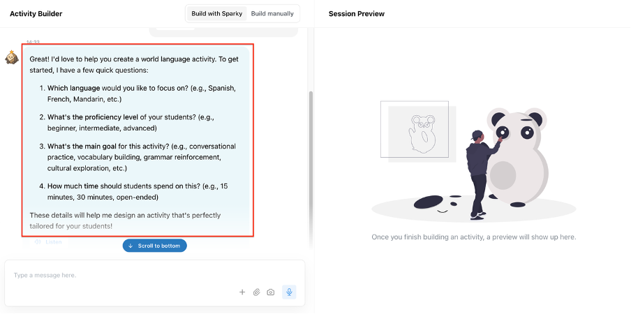 Try to be as specific as possible: Is it a picture description practice? Is it answering questions on a topic? Is it a role play? Upload questions, pictures, mark scheme if you have one and be precise about what outcome you want, especially about the type of feedback you want the pupils to receive. Once set, you can practise as a pupil in the sandbox. If not quite right, tweak. It will be worth it. The bot will be inquisitive because it’s trying to fine-tune every detail, helping you build the best possible activity before you share it with pupils.