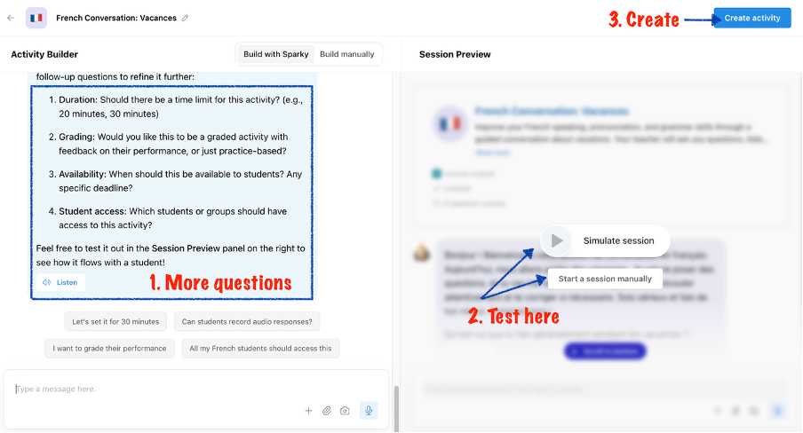 I prefer to start the session manually to be really responding like if I was a pupil. When happy, create and share with your pupils.