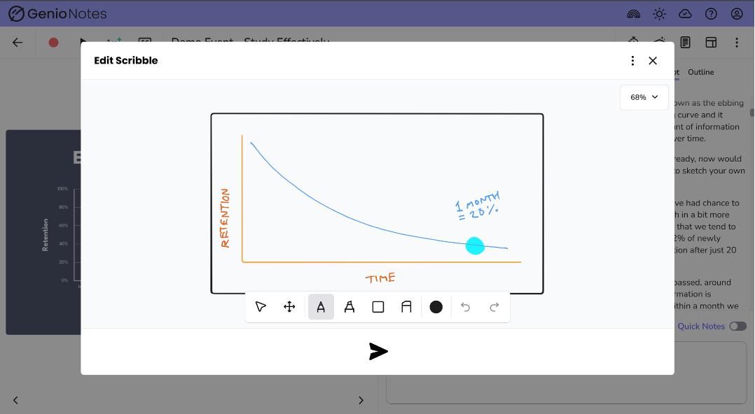 The structured outline generated by the AI acts as a scaffold to help students identify the main concepts and how they fit together. Because the outline links back to the audio, students revisit the original explanation, strengthening encoding and supporting active review. This is especially valuable in STEM subjects where content builds over time. The equation editor enables accurate capture of formulas, and the scribble feature supports quick diagrams without interrupting the flow of the lesson. These features reduce the complexity of capture while maintaining the cognitive effort needed for understanding.