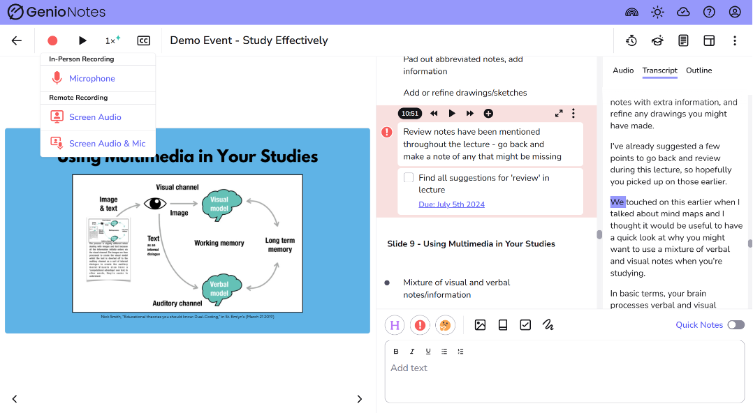 Genio Notes is designed around what we know about effective learning. Good note-taking is not about writing quickly; it is about reducing cognitive load so students can attend to the teaching while still capturing the ideas they will need later. Genio supports this by allowing students to record lesson audio, mark key moments with time-stamped notes and import teacher slides. This creates a single, organised space that encourages selective attention rather than frantic transcription.