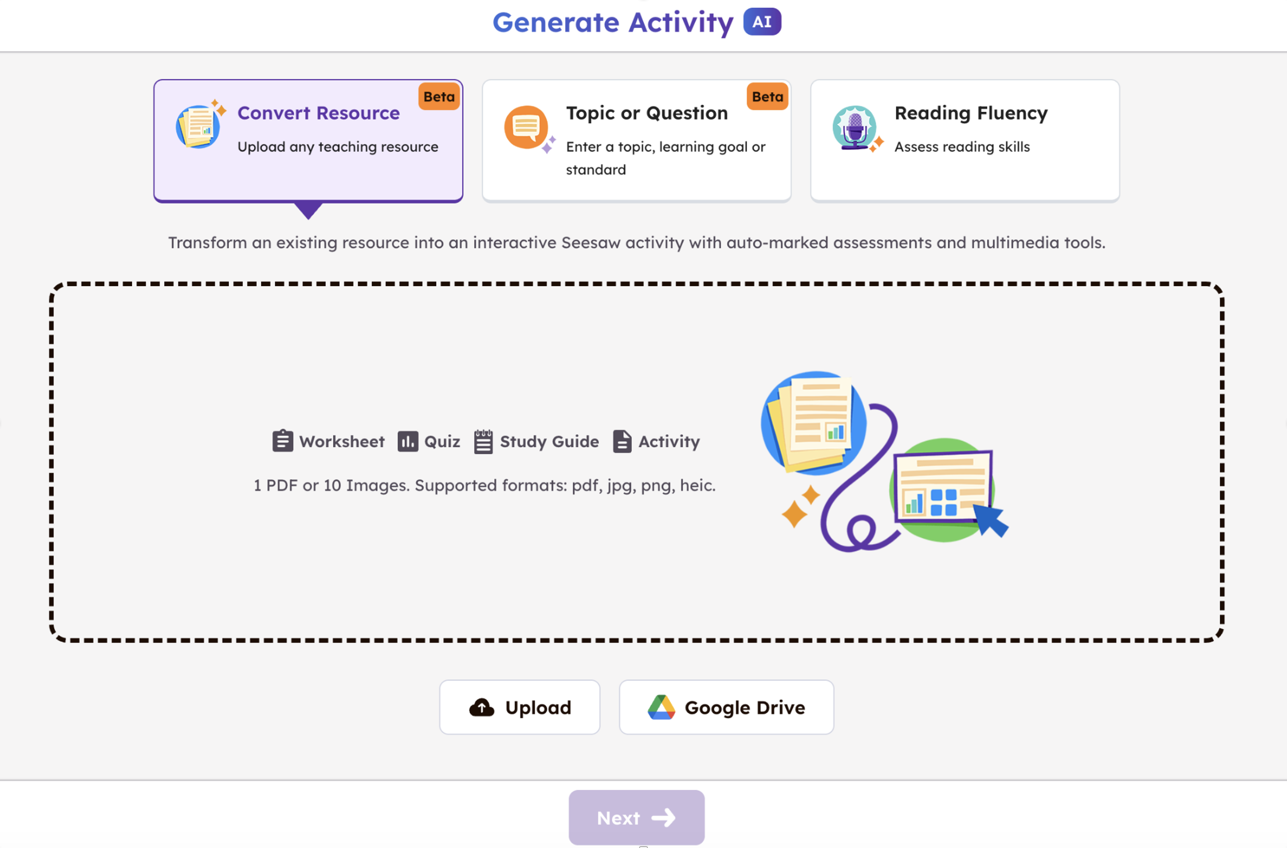One of the most helpful additions is the ability to convert existing resources into full learning activities. Teachers can upload a PDF or an image and receive an auto-generated sequence of tasks in a matter of minutes. Alternatively, a simple text prompt can produce a complete activity aligned to curriculum expectations. Both approaches create multimodal tasks with built-in assessment and space for pupils to respond creatively.