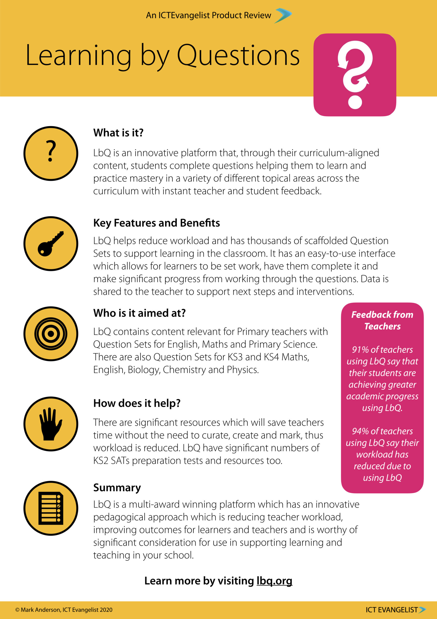 One of the most important aspects of a teacher’s role is to ask questions, to provoke and prompt learners with questions that drive forward their understanding and depth of knowledge around the different topics they have to learn. It’s not an easy thing to do, nor is it a quick thing to prepare. LbQ features more than 60,000 questions which do just that. Like many great edtech products, rather than try and replace the role of the teacher, LbQ allows you to access resources that are prepared for you, and when learners complete the questions, they are all marked automatically for you too. This is superb. It not only allows you to spend less time preparing for your lessons, but it saves you time on marking too!