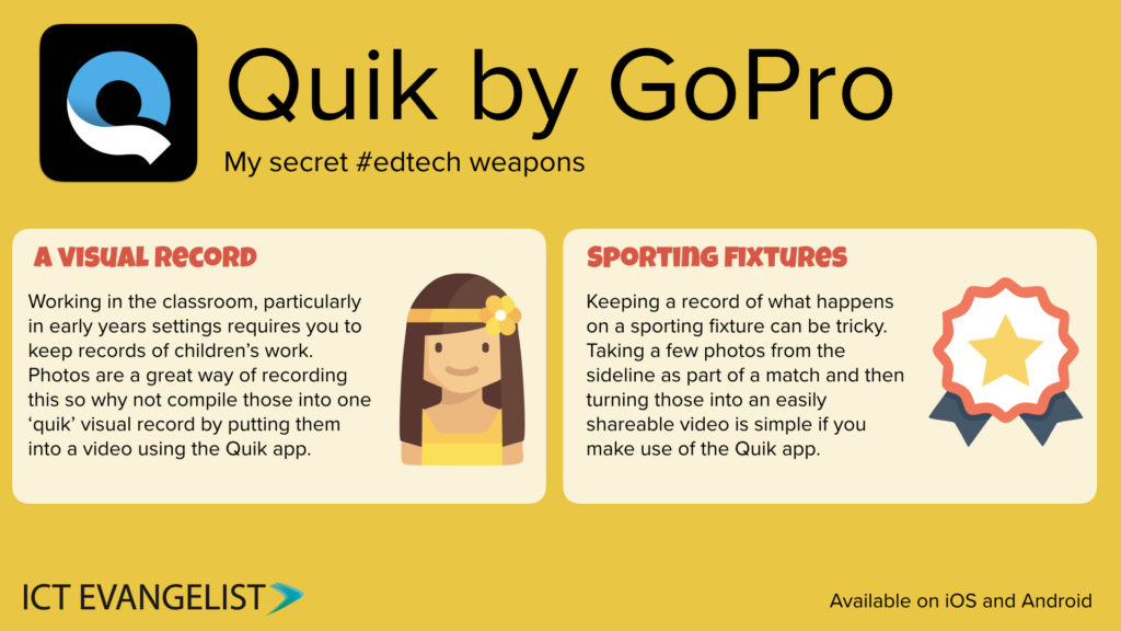 As a teacher, making effective use of edtech can be difficult because in order to get a great looking product to share with children to support their learning can take time. Not with Quik by GoPro though. Don’t get me wrong, I love iMovie and Adobe’s Premiere Clip but whilst they are both relatively easy to use, nothing compares to the ease of use and speed of Quik.